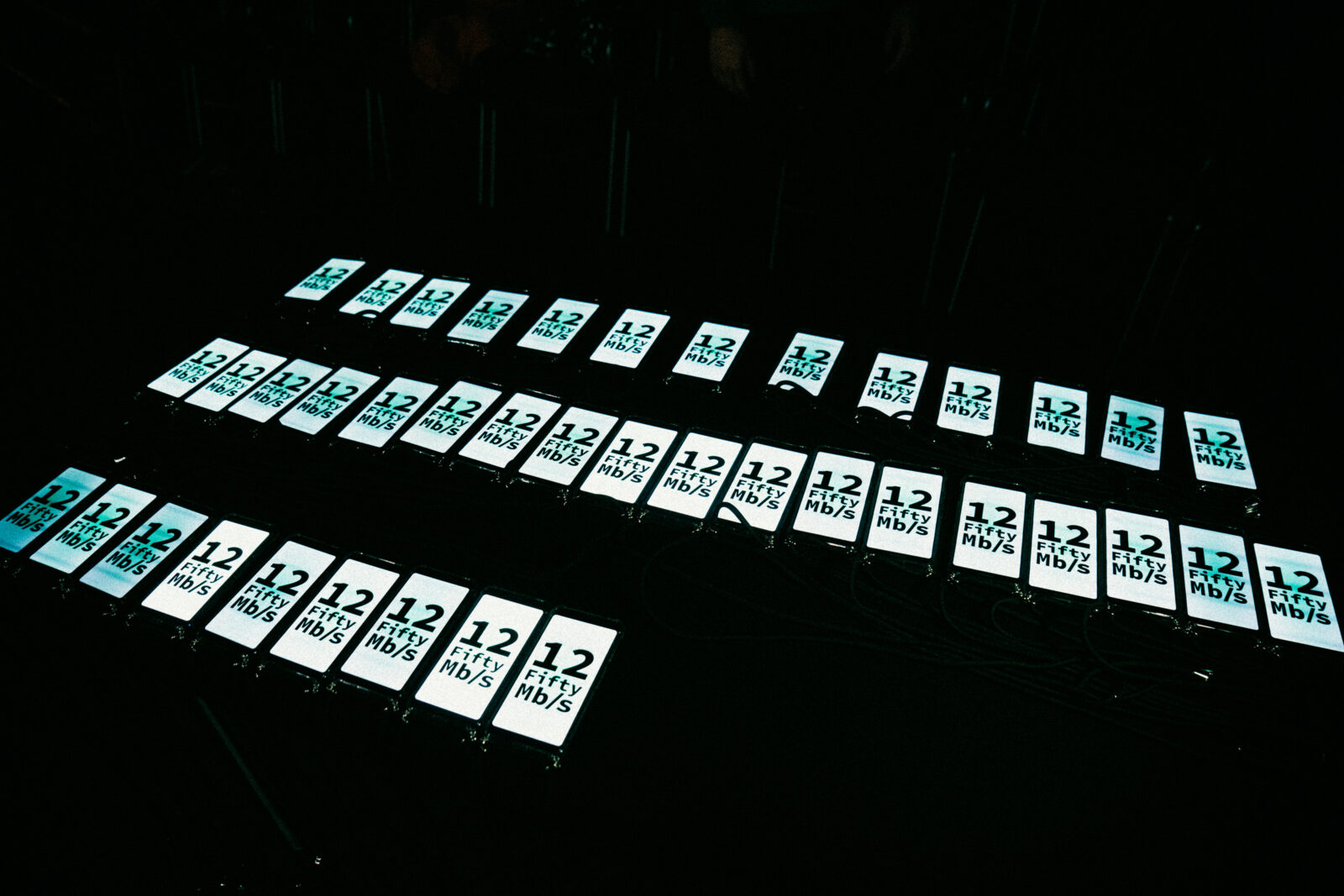 Die Tanzinstallation 12Fifty Mb/s setzt sich auf künstlerisch-ästhetische Weise mit Fragen zum Thema Datentracking auseinander. Vier Tänzer*innen begeben sich auf die Suche nach den Grenzen von Big Data und gehen der Frage nach, wie im Kontext der permanenten Datensammlung Widerstand geleistet werden kann. In Zusammenarbeit mit dem MIREVI-Team der Hochschule Düsseldorf wurde speziell für 12Fifty Mb/s eine App entwickelt, über die das Publikum Hintergrundinformationen zum Stück und zu den Performer*innen abrufen kann, die zum Teil die Grenze zur Privatsphäre überschreiten. Die Choreografie basiert auf drei Technologieformen: Motion Capture, QR-Codes und NFC-Tags. Die Bewegungen der Tänzer*innen fungieren als Rohdaten, die an die Smartphones des Publikums gesendet und in Informationen umgewandelt werden. Der zeitgenössische Tanz macht den Prozess der digitalen Vernetzung und Datenerfassung sowohl physisch als auch ästhetisch erfahrbar.