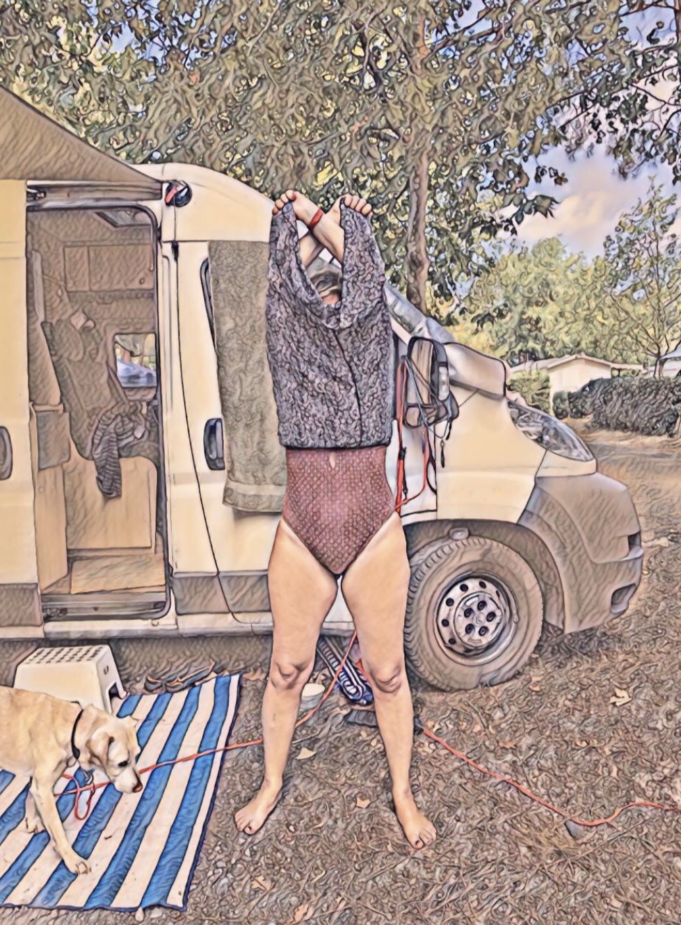 Ich recherchiere stundenlang Bilder von Romnija , die bei Protestaktion Rock über den Kopf ziehen. Lerne dabei noch einiges über RomaLeben in Rumänien und Geburtenkontrolle und Rechtspopulismus und Parallelen zu Guido Reil Rhetorik. Finde an Bildern nix, außer Personen mit Transparenten oder anzügliche Posen stereotyper Darstellungen in Z-Röcken. Am Ende versuche ich selbst eine möglichst kämpferische Haltung mit hochgezogenem Kleid und lasse mich fotografieren. Brauche das zur Stütze bei der Erstellung einer Zeichnung.