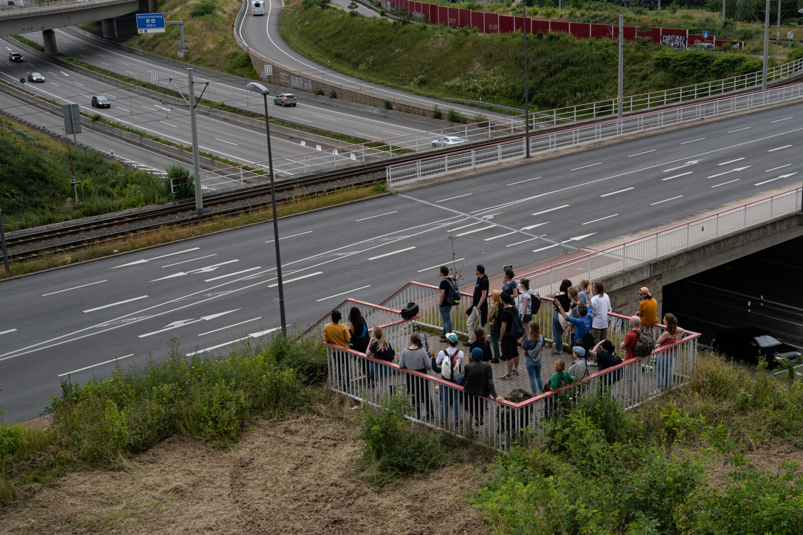 Mit SONIC HIGHWAY lädt MFK Bochum zur Ortsbegehung einer ausgewählten roten Lärmzone ein. Ein Spaziergang führt uns in körperliche und instrumentale Re- und Dissonanzen, mitten hinein in die unverhoffte Hügellandschaft eines Autobahndreiecks. Wir durchqueren und erreichen Orte, die für gewöhnlich nur aus dem vorbeirasenden PKW erhascht werden. Dort, zwischen Unrat und seltenen Gewächsen, formuliert MFK Bochum für ihre Begleiter*innen eine dis-harmonische Antwort auf diese Landschaft.